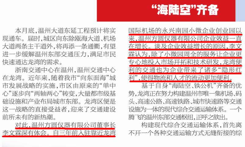 日前,溫州日報記者采訪了溫州方圓儀器有限公司董事長李文霖先生。對公司入駐靠近龍灣國際機場的永興南園以來取得的快速發(fā)展給予了充分肯定,稱贊了公司效益的巨大提升。談及企業(yè)效益增長的原因,李文霖認為,除了小微園帶來周全的服務(wù)讓企業(yè)更專心地投入市場開拓和技術(shù)研發(fā),龍灣便利的交通也為企業(yè)帶來了諸多隱形紅利,使得物流和人才的流動更加便利。愿溫州方圓儀器有限公司更上一層樓。