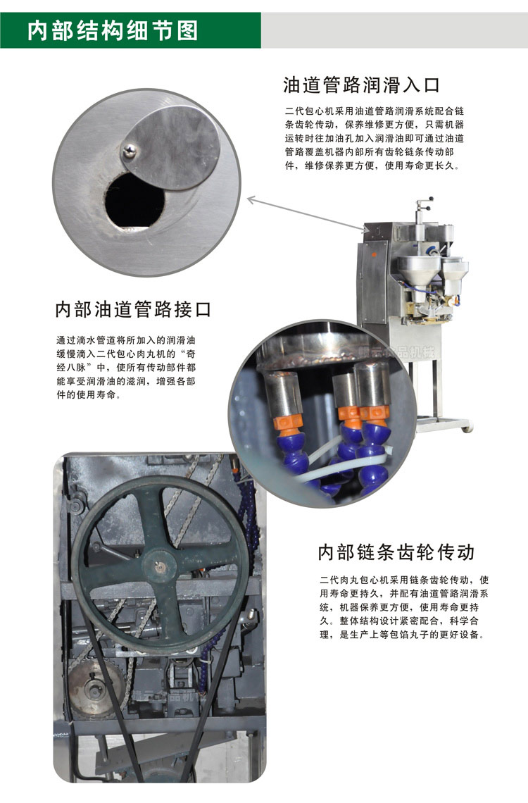 第二代包心機在第一代包心機的基礎上做了很大改進,1、材質方面,一代包芯機采用430不銹鋼材質,二代包芯機使用304不銹鋼板材,外觀上更顯檔次;2、潤滑系統(tǒng),一代包芯機采用皮帶和齒輪傳動,無潤滑系統(tǒng),一般壽命3-5年,而二代肉丸包芯機采用鏈條和齒輪傳動,并配有油道管路潤滑系統(tǒng),使用壽命是肉丸包芯機的兩倍之多