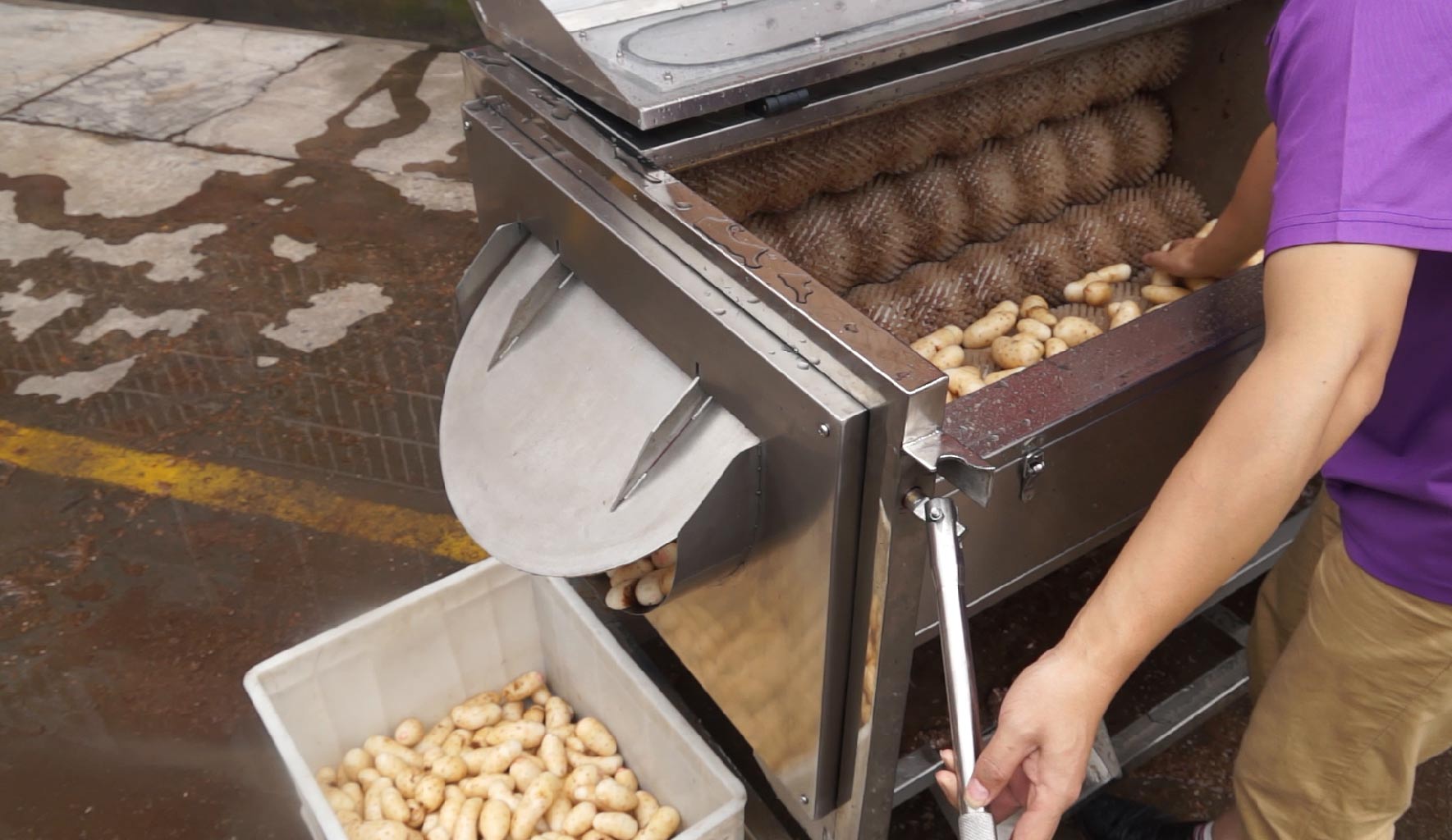 毛輥清洗機(jī)工作原理: 在電機(jī)的帶動(dòng)下通過相對(duì)逆向滾動(dòng),與產(chǎn)品直接接觸產(chǎn)生磨擦達(dá)到去皮、清洗的效果;設(shè)計(jì)有自動(dòng)高壓噴淋噴頭進(jìn)行邊去皮邊沖洗,即可達(dá)到產(chǎn)品清洗并去皮的效果;并可根據(jù)產(chǎn)品品種更換毛刷棍毛的硬度,選用絲質(zhì)較硬的毛刷輥,可以達(dá)到根莖類果蔬去皮效果,選用絲質(zhì)較軟的毛刷輥,可達(dá)到給果蔬上臘拋光的作用。并要注意的是,工作時(shí)要先開機(jī)運(yùn)行后再投料,可以延長(zhǎng)電機(jī)壽命,減少電機(jī)損壞的機(jī)率。毛輥清洗機(jī)維護(hù)保養(yǎng)務(wù)必先將電源開關(guān)關(guān)掉,使設(shè)備處于停機(jī)狀態(tài)下進(jìn)行。