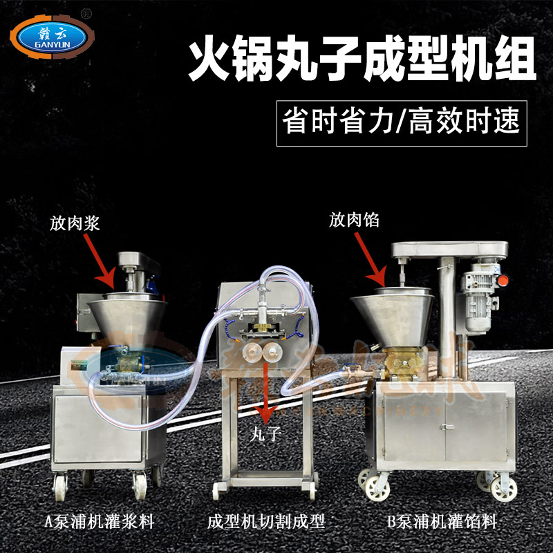 多功能火鍋料組合成型機(jī)組是由兩臺泵浦機(jī)和一臺火鍋料成型機(jī)組合而成,泵浦機(jī)起灌漿作用,火鍋料成型機(jī)起成型作用。本套成型機(jī)組可成型多種規(guī)格丸子,多種不同花色的丸子,又可稱為多樣丸子機(jī),花樣丸子機(jī),單色丸子機(jī),多色丸子機(jī)等等。