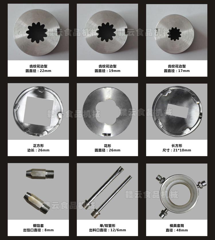 火鍋丸子成型機(jī)安裝不同形狀的模具,成型出不同的火鍋丸子。可成型丸子種類繁多,例如:夾心墨魚條、魚肉卷、魚豆腐、甜不辣、麻花卷、魚排、開口笑黃金包、蟹肉棒、各種實心包心丸子等。